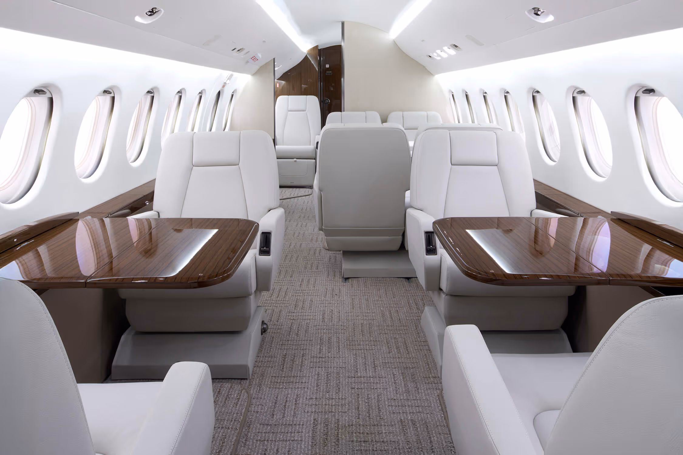 Premium leathers, handcrafted wood veneers, and Dassault’s signature quiet-cabin engineering make long flights exceptionally comfortable. The 6’2” cabin height allows most passengers to stand upright, while the 7.7-foot width creates a spacious lounge-like atmosphere.