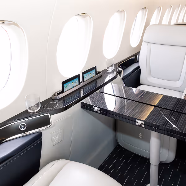 The Falcon 2000EX offers one of the widest cabins in its class, designed to feel open, quiet, and welcoming. The interior layout typically includes executive club seating, a conference or dining area, large foldout worktables, and a fully private rear lavatory.